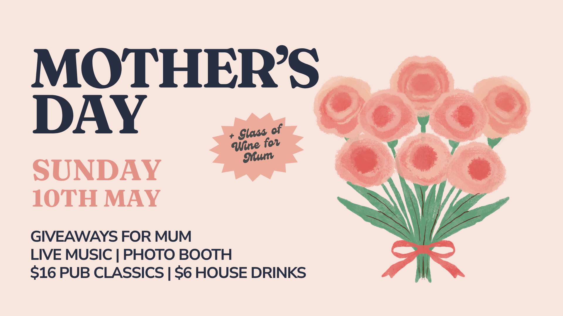 • Wine on Arrival: Book your table in advance and we’ll have a complimentary glass of wine waiting for Mum. Please let us know you’re celebrating Mother’s Day when booking!